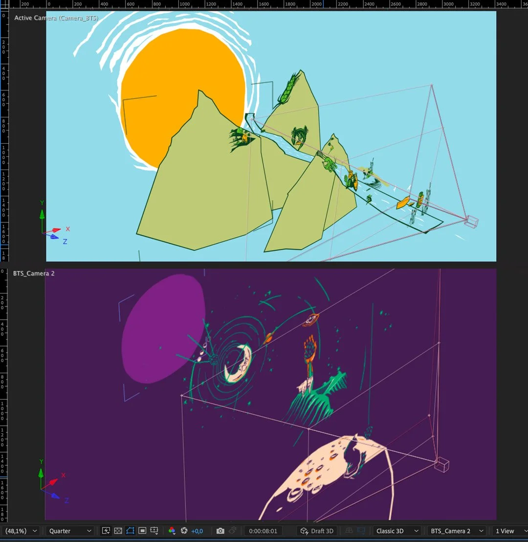 Captura de los entornos digitales 3D construidos para animar los dos mundos distintos, donde se anima la cámara avanzando en el eje Z.