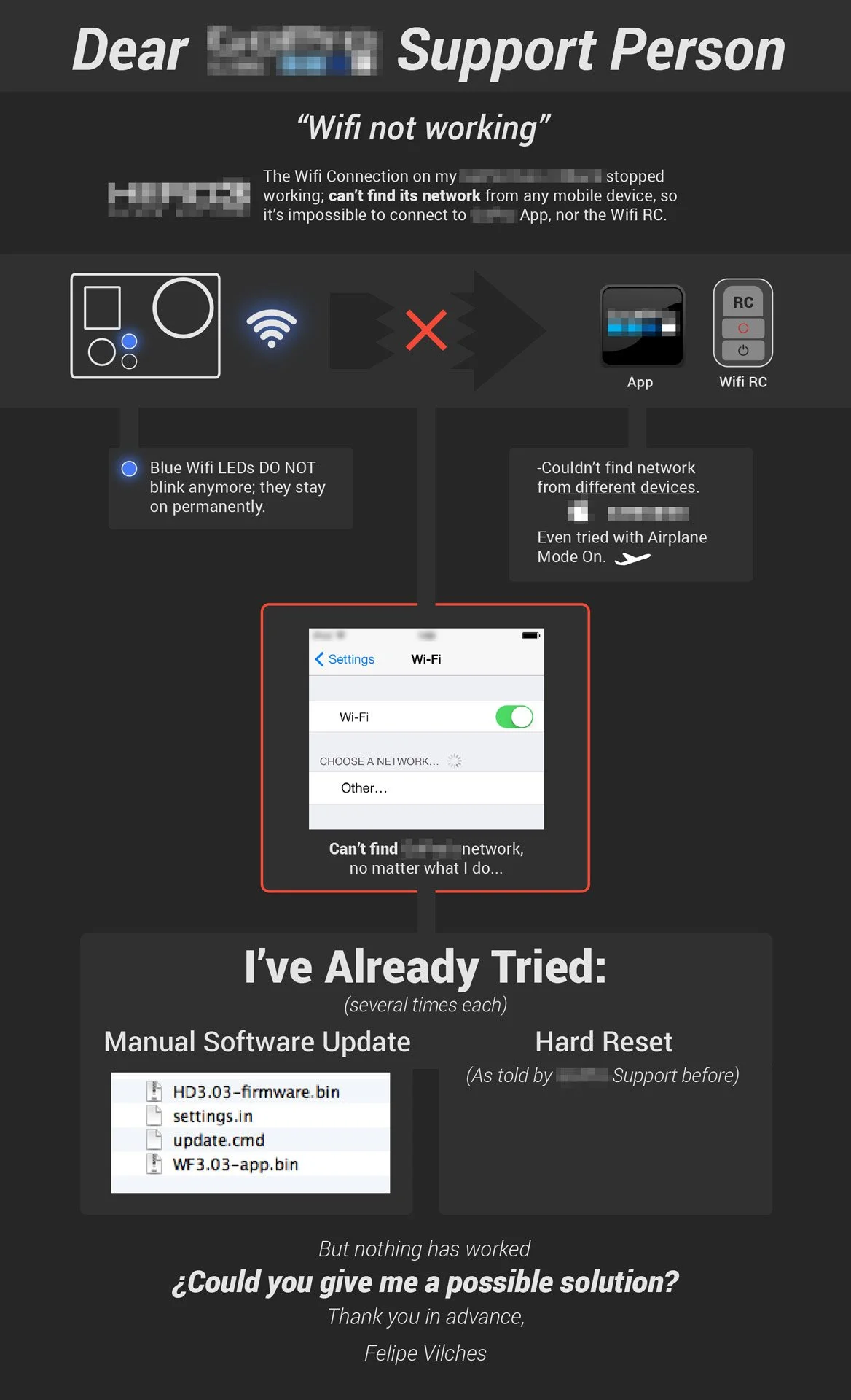Esto último debí haberlo sospechado ya en 2014, durante en mi época estudiantil, cuando escribí al servicio técnico de una reconocida empresa fabricante de cámaras de acción en busca de resolver un desperfecto técnico, y mi correo se volvió tan extenso que terminé transformándolo en una infografía, para intentar explicar lo mejor posible mi caso y aumentar mis posibilidades de recibir de vuelta una respuesta reveladora. (Quedará para otra ocasión y para interpretación subjetiva, la evaluación psicológica de estas conductas, y si acaso responden a patrones controladores, trastornos inseguros o mera genialidad).